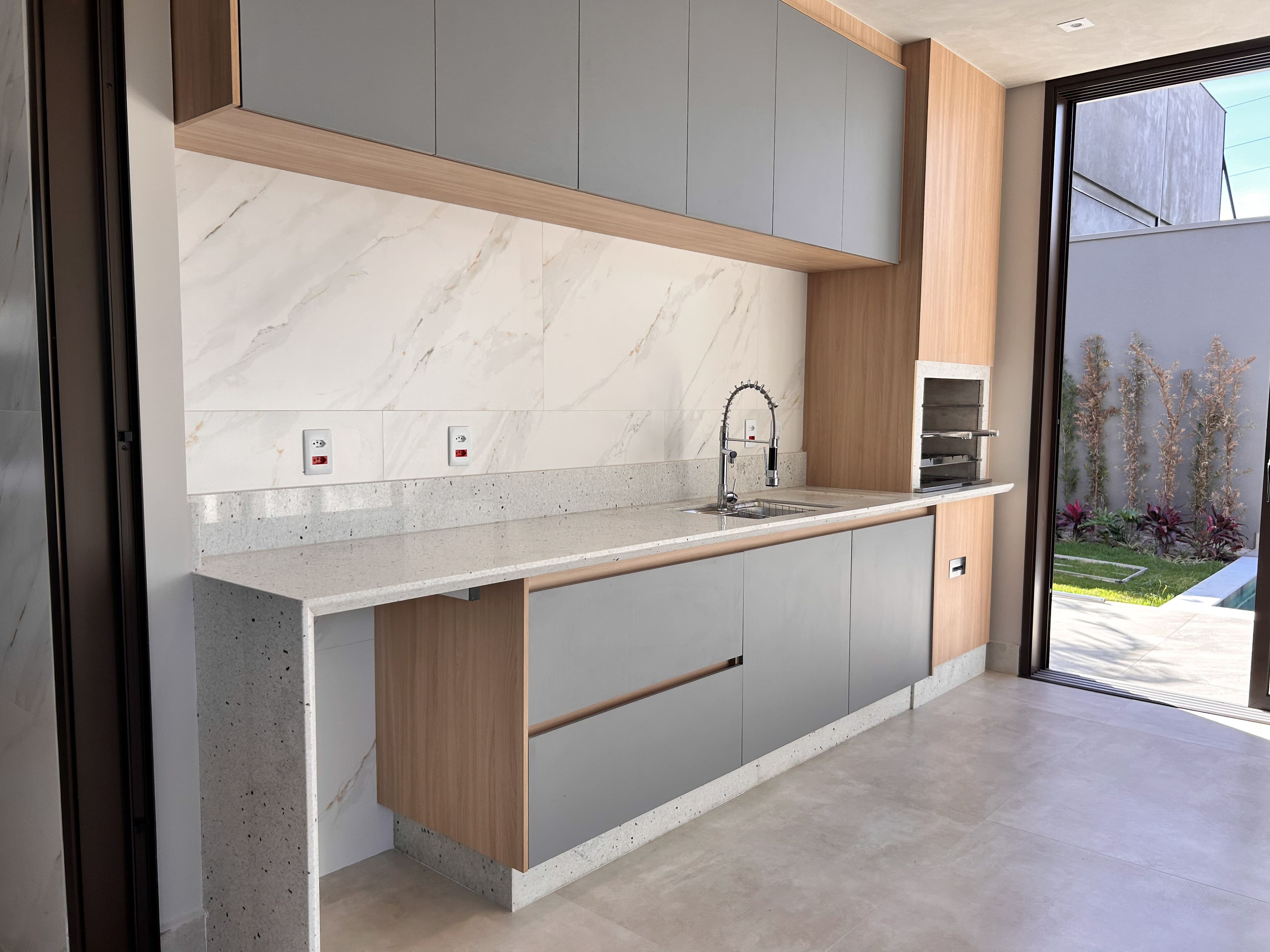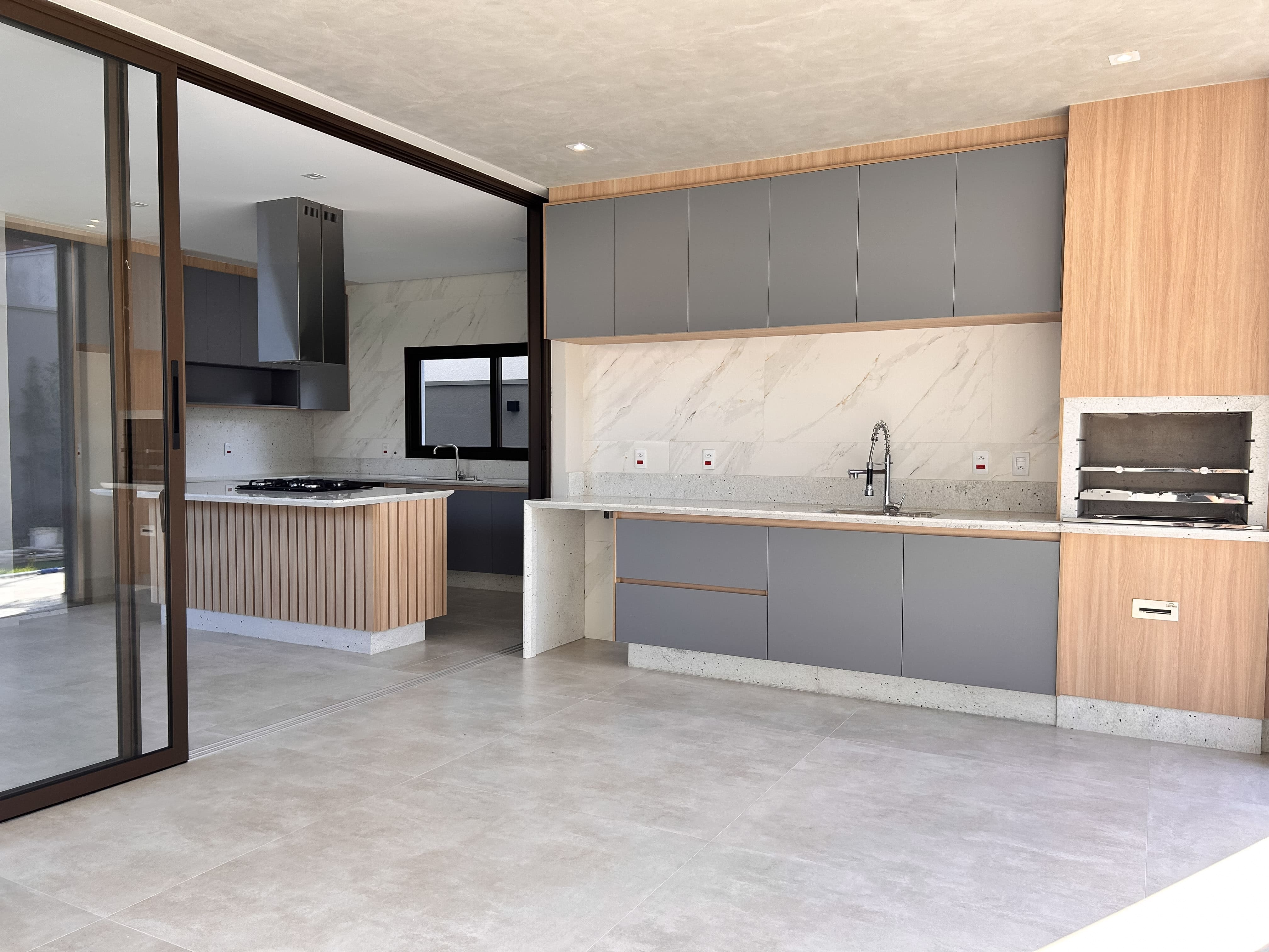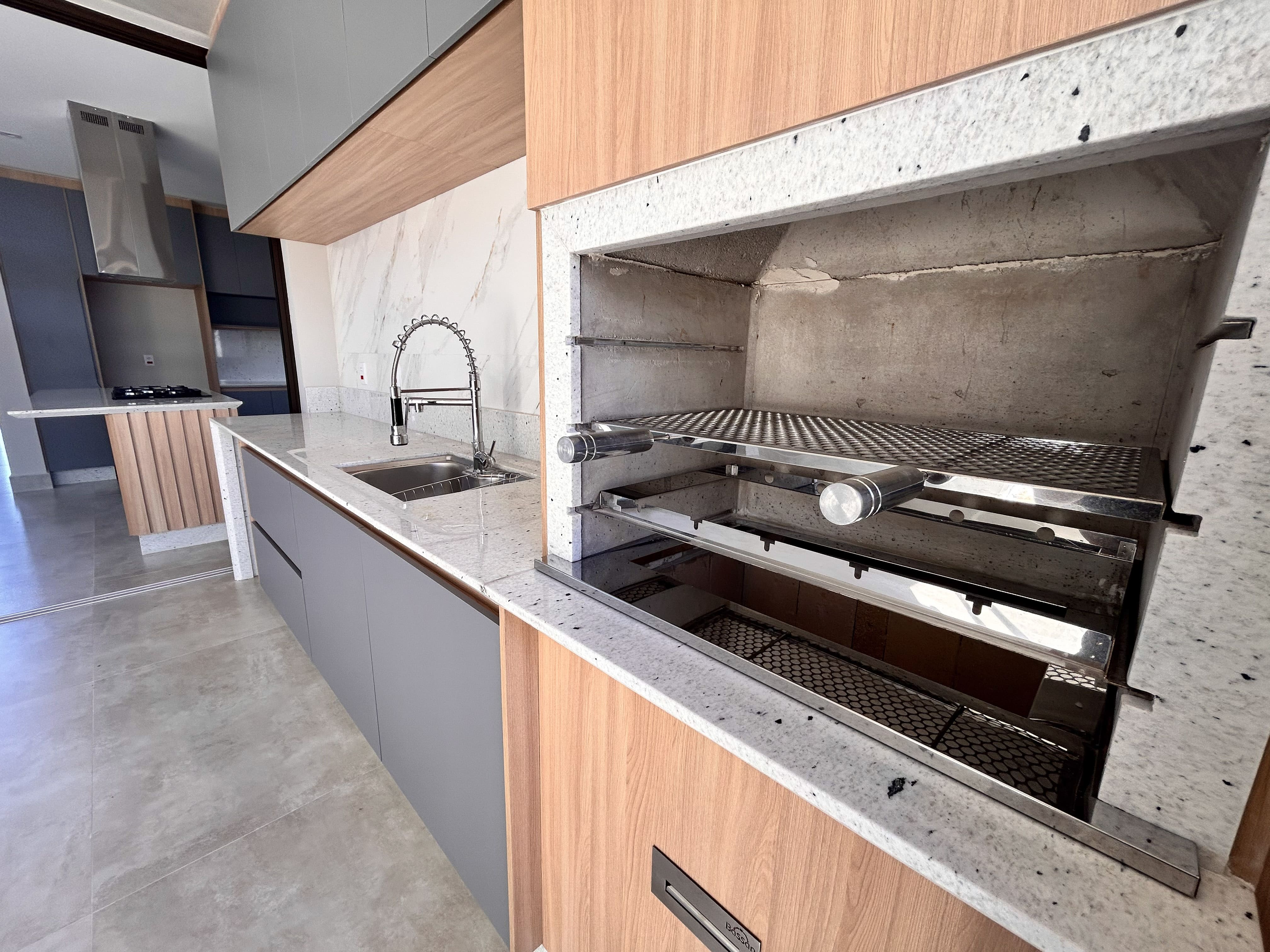 - Área gourmet com churrasqueira e cervejeira, integrada ou separada da cozinha por porta divisória